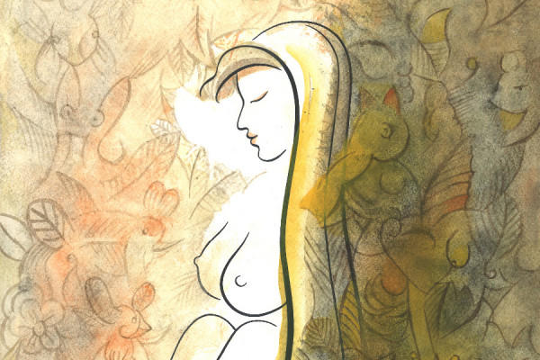 Linearne akty kobiece, ukryte częściowo w niezdefiniowanych wyraźnie formach, barwach i płaszczyznach o tajemnych niedopowiedzianych znaczeniach.